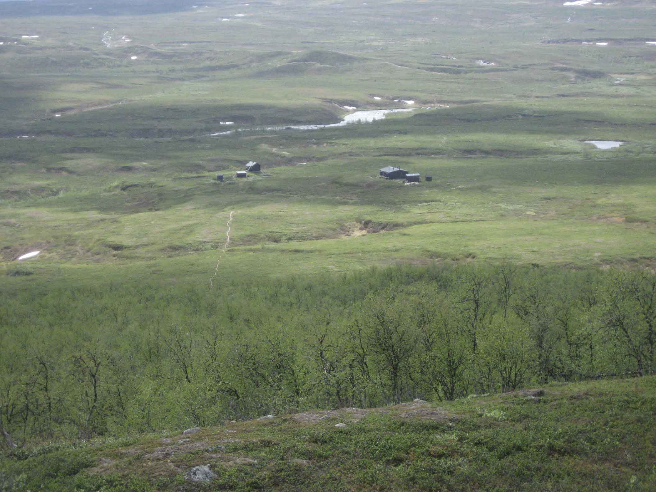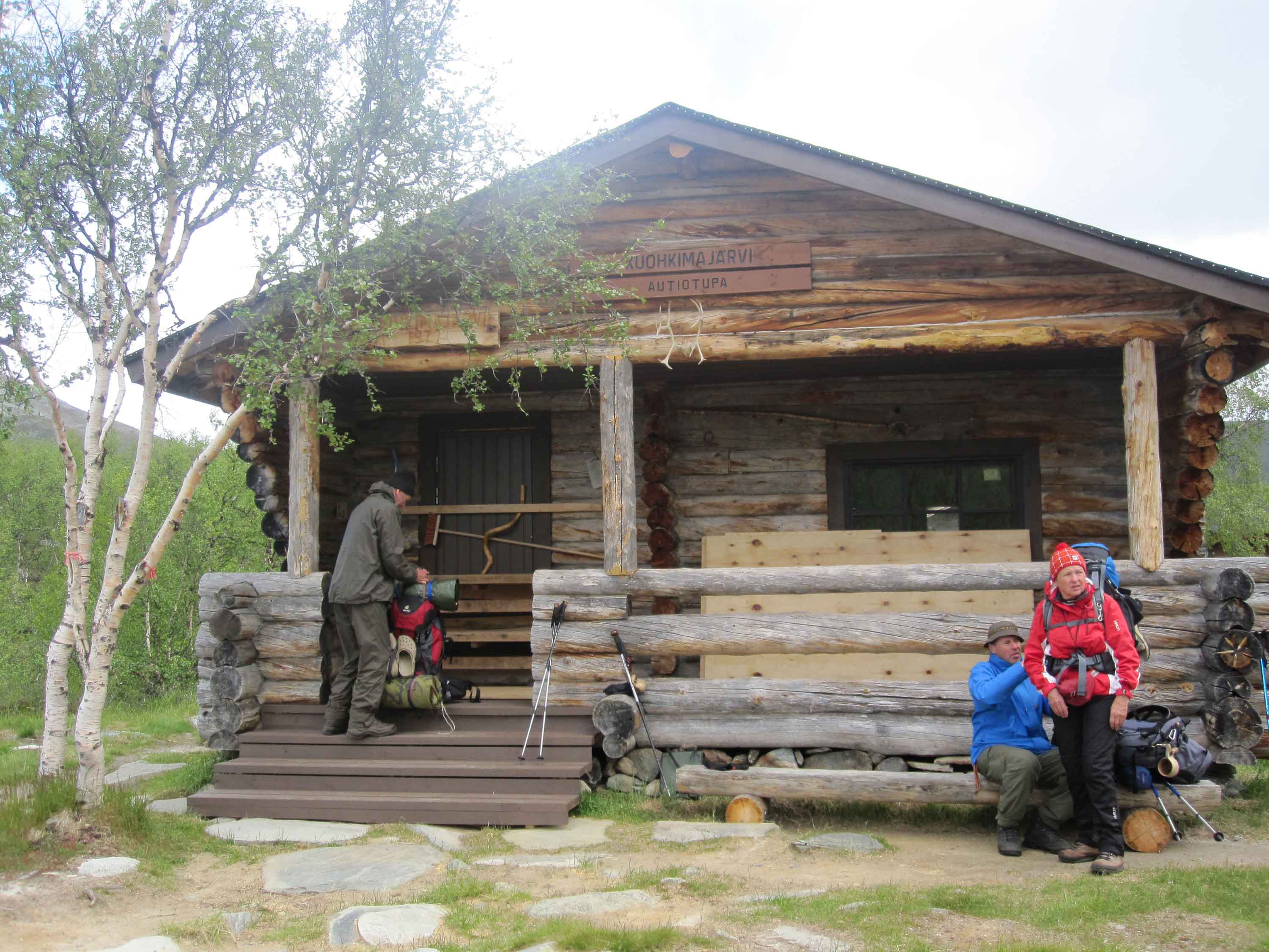Seuraava päivä oli myös aurinkoinen. Kohtasimme polulla samalla Malla-laivalla tulleet pojat. He olivat kokeilleet kalaonneaan lähistön järvissä. Saalista ei kuulema tullut. Kun polku alkoi laskeutua ja saavutimme tunturikoivumetsikön, Pältsanin tupa tuli näkyviin.