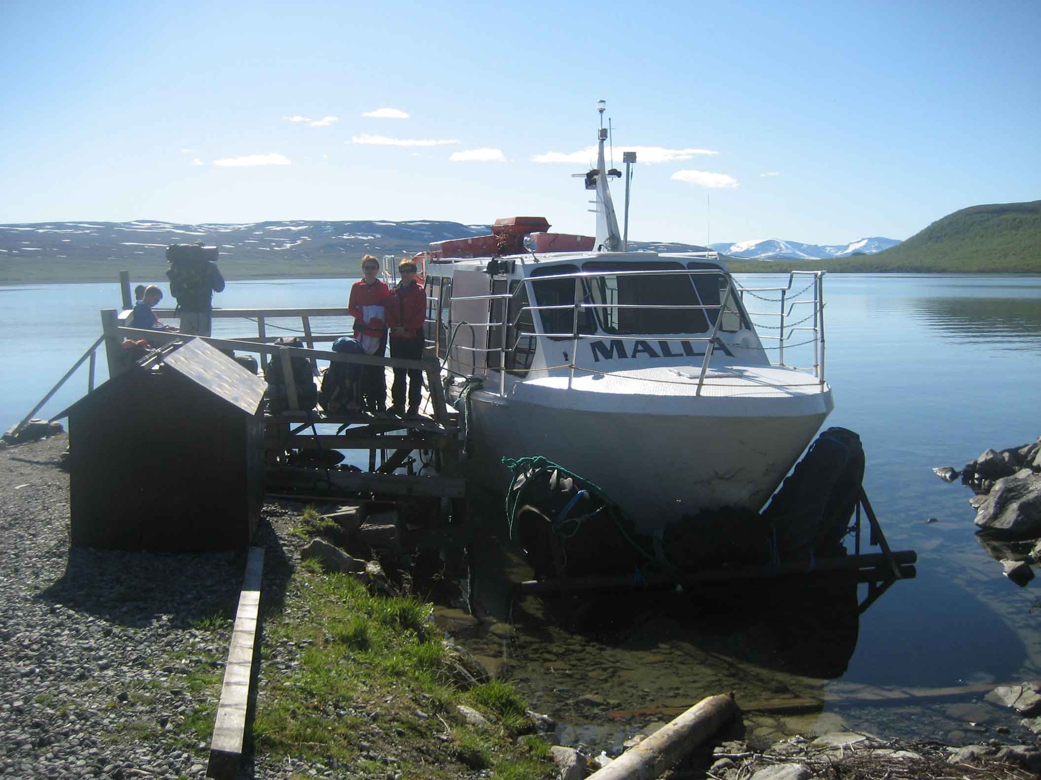 Menimme Kilpisjärven yli Malla- laivalla ja palatessa ajattelimme vaeltaa järven rantaa Pikku Mallan kautta. Laivakyyti maksoi  muistaakseni noin parikymppiä hengeltä. Retkeilymajasta saimme laivan aikataulut ja kipparin puhelinnumeron, jos vaelluksen paluuosuudella pitäisi tiedustella laivan kulkemisia.